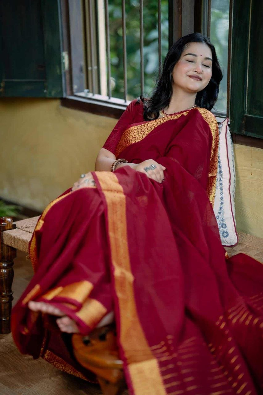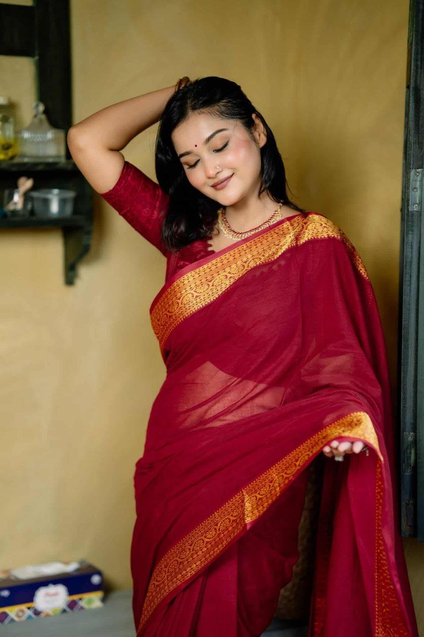 শাড়ির পুরো অংশে সূক্ষ্ম সুতার কাজ করা, যা আপনার লুকে আনবে অনন্যতা।